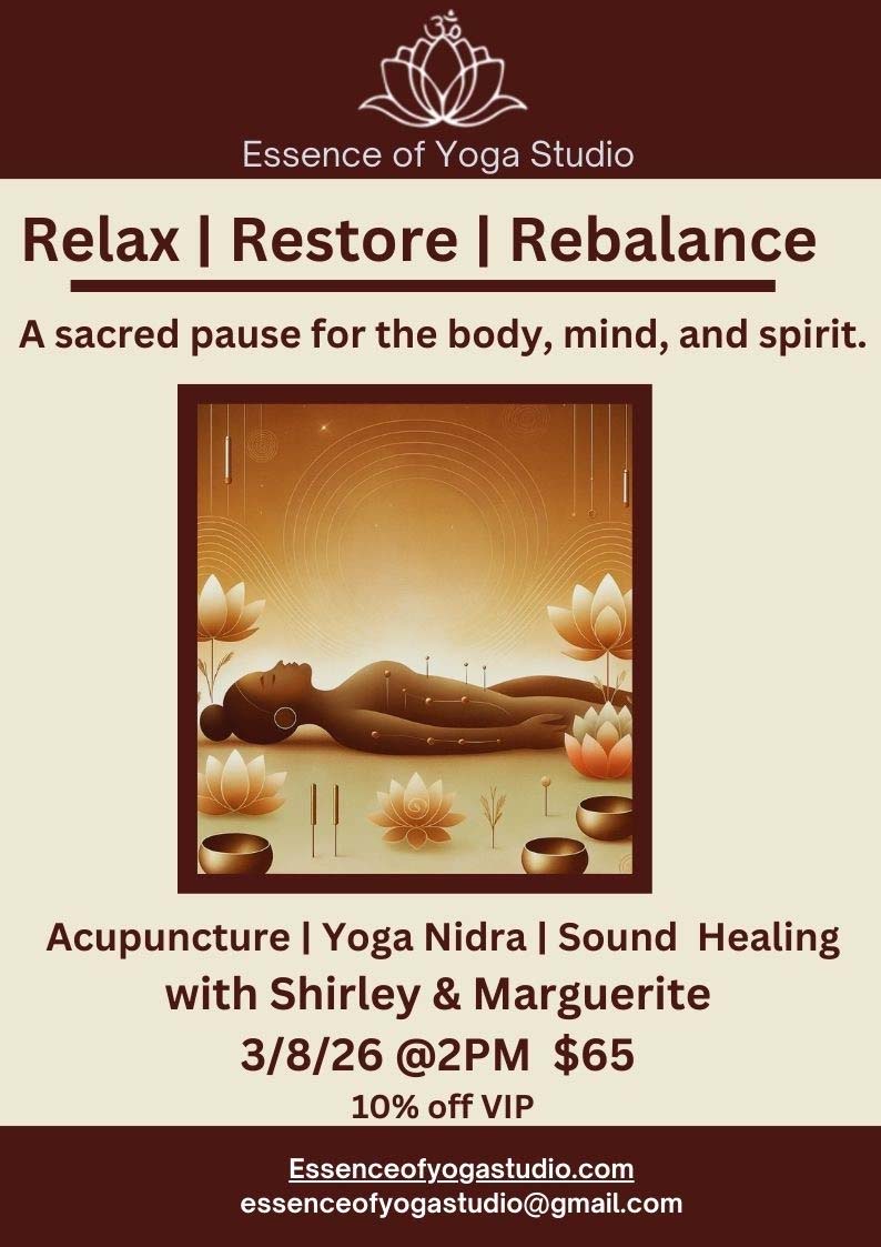 Join us on March 8 at 2pm for a deeply restorative workshop blending acupuncture, Yoga Nidra, and sound healing — a powerful trio designed to calm the nervous system, release stored tension, and bring you back into balance.